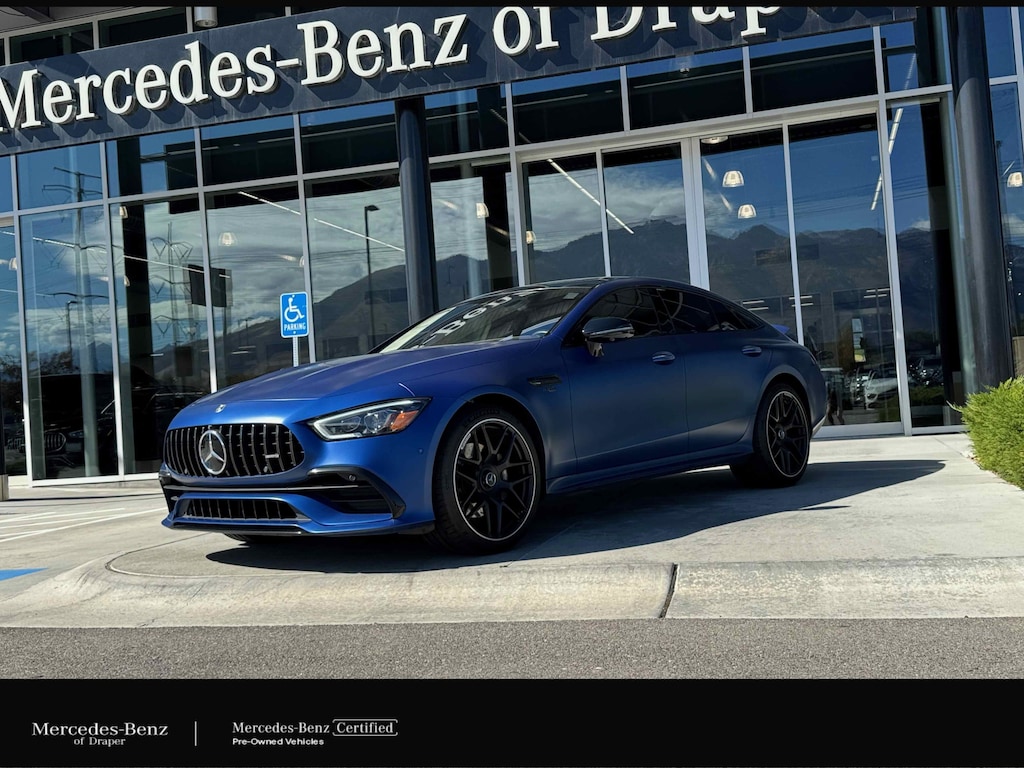 Mercedes-Benz of Draper proudly offers this 2022 Blue Mercedes-Benz AMG® GT 53 Base AWD . It is well equipped and includes these features and benefits: 14 Speakers, 4-Wheel Disc Brakes, ABS brakes, Adaptive suspension, Air Conditioning, Alloy wheels, AM/FM radio: SiriusXM, Apple CarPlay®/Android Auto®, Auto High-beam Headlights, Auto tilt-away steering wheel, Auto-dimming door mirrors, Auto-dimming Rear-View mirror, Automatic temperature control, Brake assist, Bumpers: body-color, Burmester® Surround Sound System, Child-Seat-Sensing Airbag, Compass, Delay-off headlights, Driver door bin, Driver vanity mirror, Dual front impact airbags, Dual front side impact airbags, Electronic Stability Control, Emergency communication system: Mercedes me connect, Exterior Parking Camera Rear, Four wheel independent suspension, Front anti-roll bar, Front Bucket Seats, Front Center Armrest, Front dual zone A/C, Front reading lights, Fully automatic headlights, Garage door transmitter, Head restraints memory, Heated door mirrors, Heated Front Seats, Heated front seats, Heated Power Front Bucket Seats, Illuminated entry, Knee airbag, Leather Shift Knob, Low tire pressure warning, MB-Tex/Microfiber Upholstery, Memory seat, Navigation System, Occupant sensing airbag, Outside temperature display, Overhead airbag, Overhead console, Panic alarm, Passenger door bin, Passenger vanity mirror, Power adjustable front head restraints, Power door mirrors, Power driver seat, Power Liftgate, Power moonroof, Power passenger seat, Power steering, Power windows, Premium audio system: MBUX, Radio data system, Radio: MBUX Infotainment & Navigation System, Rain sensing wipers, Rear anti-roll bar, Rear reading lights, Rear window defroster, Remote keyless entry, Security system, Speed control, Speed-sensing steering, Speed-Sensitive Wipers, Spoiler, Sport steering wheel, Steering wheel memory, Steering wheel mounted audio controls, Tachometer, Telescoping steering wheel, Tilt steering wheel, Traction control, Trip computer, Turn signal indicator mirrors, Variably intermittent wipers, and Wheels: 9.5 x 19 Fr/11 x 19 Rr AMG® Multispoke.