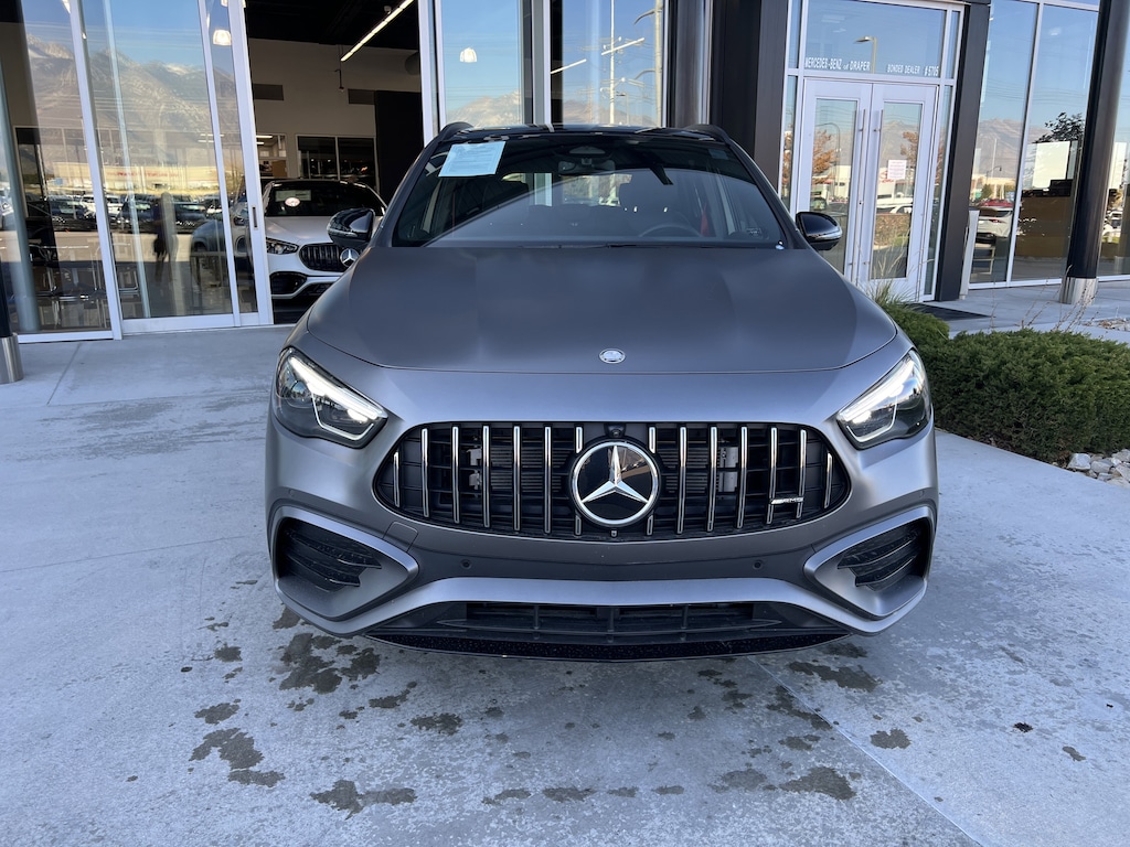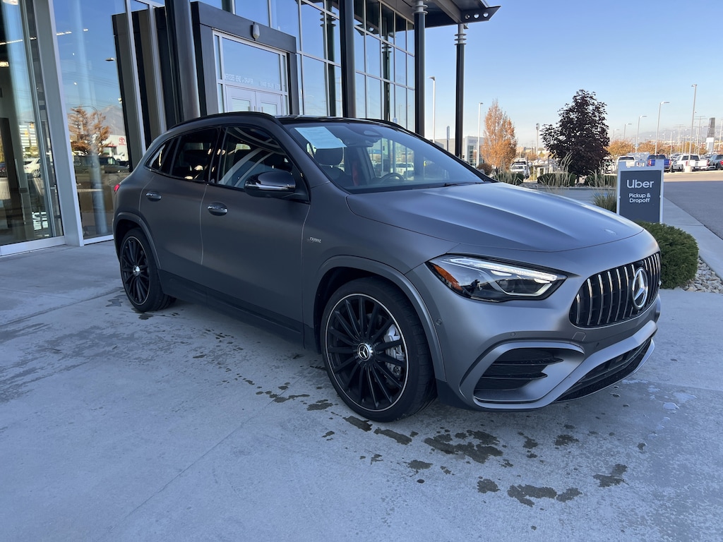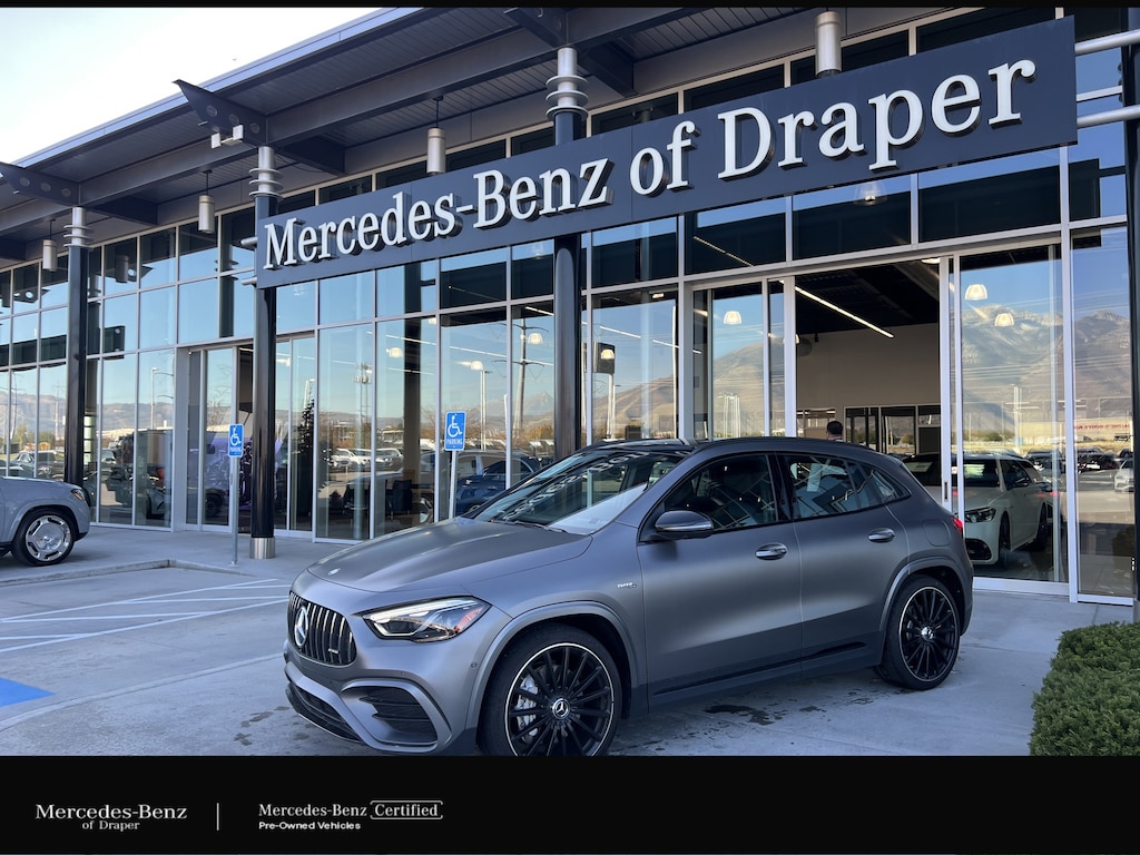 Mercedes-Benz of Draper proudly offers this 2025 MANUFAKTUR Mountain Gray Magno Mercedes-Benz GLA GLA 35 AMG AWD . It is well equipped and includes these features and benefits: AMG® Night Package (Front Splitter & Trim in High-Gloss Black), Parking Package w/360 Degree Camera, Pinnacle Trim Package (Active LED Headlamps, AMG® Head Up Display, AMG® Illuminated Door Sills, Augmented Video for Navigation, MB Navigation, MBUX Interior Assistant, Surround Lighting w/Projection of Brand Logo, and Traffic Sign Assist), Winter Package (Heated Steering Wheel and Heated Washer System), Mercedes-Benz Certified Pre-Owned Certified, 2.0L I4 Turbocharged, 12 Speakers, 4-Wheel Disc Brakes, ABS brakes, Adaptive suspension, Adjustable Second Row, Air Conditioning, All-Season Floor Mats 4 Pieces Front/Rear, Alloy wheels, AM/FM radio: SiriusXM, Apple CarPlay®/Android Auto®, Auto High-beam Headlights, Auto-dimming Rear-View mirror, Automatic temperature control, Brake assist, Bumpers: body-color, Child-Seat-Sensing Airbag, Delay-off headlights, Driver door bin, Driver vanity mirror, Dual front impact airbags, Dual front side impact airbags, Electronic Stability Control, Emergency communication system: eCall Emergency System and Active Emergency Stop Assist, Extended Mobility Tires, Exterior Parking Camera Rear, First Aid Kit, Four wheel independent suspension, Front anti-roll bar, Front Bucket Seats, Front Center Armrest, Front dual zone A/C, Front reading lights, Fully automatic headlights, Garage door transmitter, Heated door mirrors, Heated front seats, Heated Front Sport Seats, Illuminated entry, Knee airbag, Leather steering wheel, Low tire pressure warning, MB-Tex/Microfiber Upholstery, Memory seat, Occupant sensing airbag, Outside temperature display, Overhead airbag, Overhead console, Panic alarm, Passenger door bin, Passenger vanity mirror, Power door mirrors, Power driver seat, Power Liftgate, Power moonroof, Power passenger seat, Power steering, Power windows, Premium audio system: MBUX, Radio data system, Radio: MBUX Multimedia System, Rain sensing wipers, Rear anti-roll bar, Rear fog lights, Rear reading lights, Rear window defroster, Rear window wiper, Remote keyless entry, Security system, Speed control, Speed-sensing steering, Split folding rear seat, Spoiler, Sport steering wheel, Steering wheel mounted audio controls, Tachometer, TBD Axle Ratio, Telescoping steering wheel, Tilt steering wheel, Traction control, Trip computer, Turn signal indicator mirrors, Variably intermittent wipers, Wheel Locking Bolts, and Wheels: 21 AMG® Multi-Spoke Matte Black.