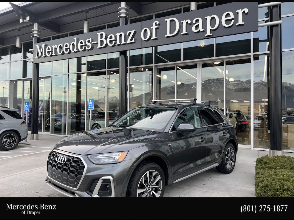 Mercedes-Benz of Draper proudly offers this 2023 Daytona Gray Pearl Audi Q5 45 S line Premium AWD . It is well equipped and includes these features and benefits: Convenience Package (Audi Advanced Key, Auto-Dimming Power Folding Exterior Mirrors, Driver Seat Memory, Heated Steering Wheel, and SiriusXM w/360L), Black Leather, 10 Speakers, 4-Wheel Disc Brakes, 5.302 Axle Ratio, ABS brakes, Air Conditioning, Alloy wheels, AM/FM radio, Audi Beam-Rings, Audi Guard All-Weather Floor Mats (Set of 4), Auto-dimming Rear-View mirror, Automatic temperature control, Brake assist, Bumpers: body-color, Compass, Delay-off headlights, Driver door bin, Driver vanity mirror, Dual front impact airbags, Dual front side impact airbags, Electronic Stability Control, Emergency communication system: Audi connect CARE, Exterior Parking Camera Rear, Four wheel independent suspension, Front anti-roll bar, Front Bucket Seats, Front Center Armrest, Front dual zone A/C, Front fog lights, Front reading lights, Garage door transmitter: HomeLink, Genuine wood console insert, Genuine wood dashboard insert, Genuine wood door panel insert, Gray-Brown Birch Natural Wood Inlays, Heated 8-Way Power Front Bucket Seats, Heated door mirrors, Heated front seats, Illuminated entry, Integrated Toll Module Delete (DISC), Leather Seating Surfaces, Leather Shift Knob, Low tire pressure warning, Occupant sensing airbag, Outside temperature display, Overhead airbag, Overhead console, Panic alarm, Panoramic Sunroof, Passenger door bin, Passenger vanity mirror, Power door mirrors, Power driver seat, Power Liftgate, Power passenger seat, Power steering, Power windows, Privacy Trunk Cover, Radio data system, Radio: Audi Sound System, Rain sensing wipers, Rear air conditioning, Rear anti-roll bar, Rear fog lights, Rear reading lights, Rear seat center armrest, Rear window defroster, Rear window wiper, Remote keyless entry, Roof rack, Security system, Speed control, Speed-sensing steering, Speed-Sensitive Wipers, Split folding rear seat, Spoiler, Steering wheel mounted audio controls, Tachometer, Telescoping steering wheel, Tilt steering wheel, Traction control, Trip computer, Turn signal indicator mirrors, Variably intermittent wipers, Wheels: 18 5-Arm-Turbine Design, and Wheels: 19 5-Double-Arm Design Bi-Color Finish.