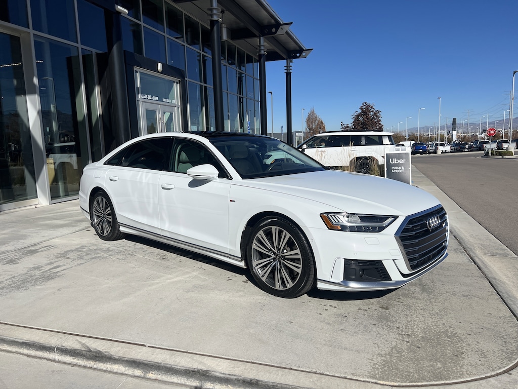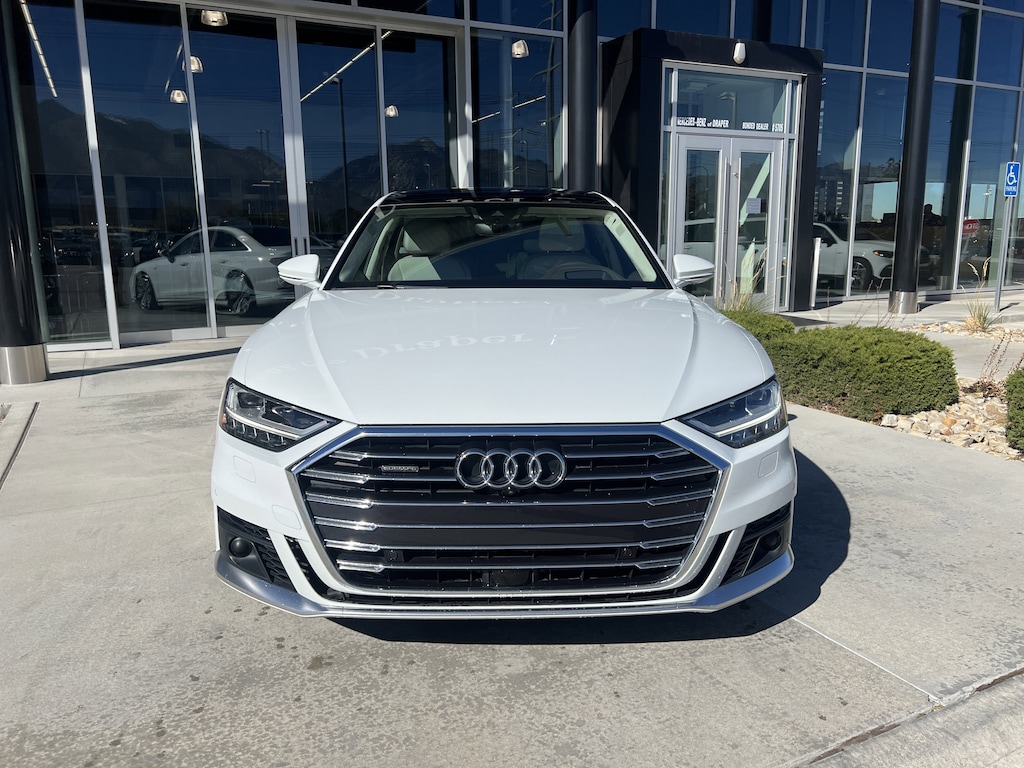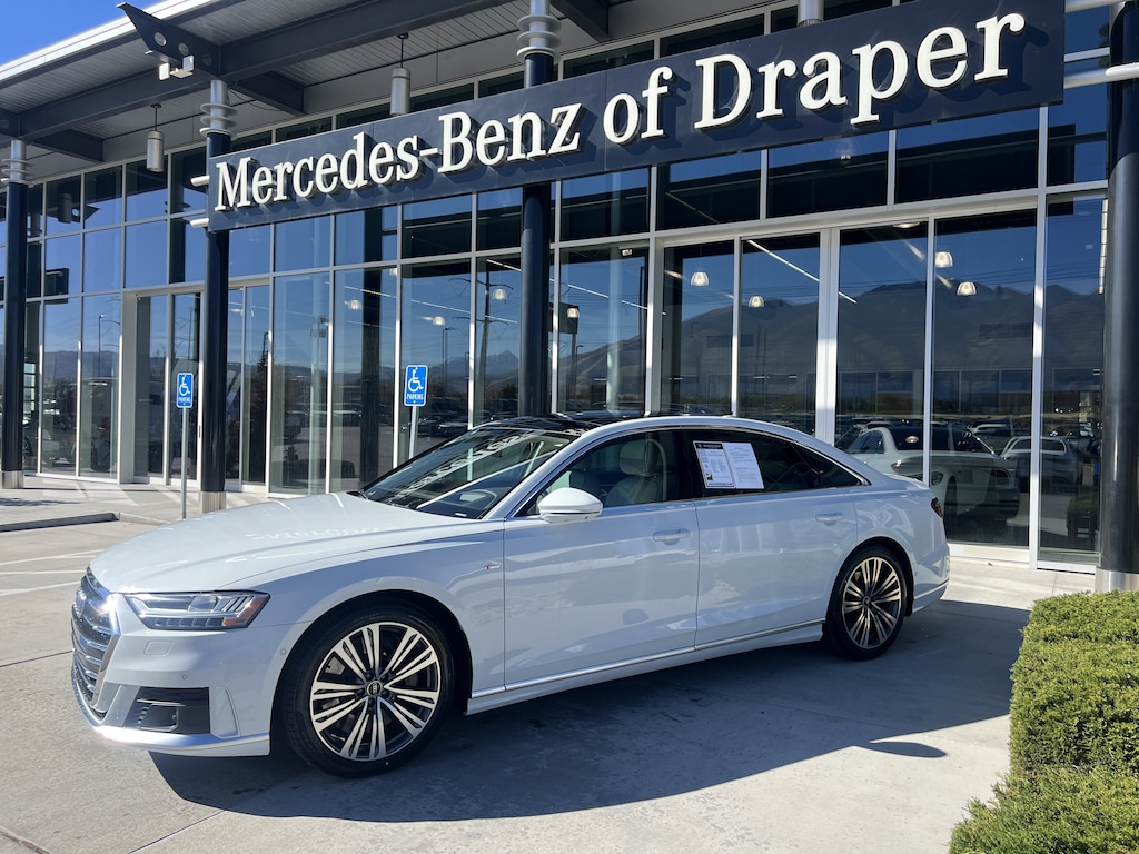 Mercedes-Benz of Draper proudly offers this 2021 White Audi A8 4.0 AWD . It is well equipped and includes these features and benefits: Leather, 17 Speakers, 22-Way Heated Multi-Contour Comfort Front Seats, 4-Wheel Disc Brakes, ABS brakes, Adaptive suspension, Air Conditioning, Alloy wheels, AM/FM radio: SiriusXM, Audi smartphone interface (Apple CarPlay/Android Auto), Auto High-beam Headlights, Auto tilt-away steering wheel, Auto-dimming door mirrors, Auto-dimming Rear-View mirror, Auto-leveling suspension, Automatic temperature control, Bang & Olufsen 3D Premium Sound System, Brake assist, Bumpers: body-color, Compass, Delay-off headlights, Door auto-latch, Driver door bin, Driver vanity mirror, Dual front impact airbags, Dual front side impact airbags, Electronic Stability Control, Emergency communication system, Four wheel independent suspension, Front anti-roll bar, Front Bucket Seats, Front Center Armrest w/Storage, Front dual zone A/C, Front fog lights, Front reading lights, Garage door transmitter: HomeLink, Genuine wood console insert, Head restraints memory, Headlight cleaning, Heated door mirrors, Heated front seats, HVAC memory, Illuminated entry, Knee airbag, Leather Shift Knob, Leather steering wheel, Low tire pressure warning, Memory seat, Navigation system: MMI Navigation plus, Occupant sensing airbag, Outside temperature display, Overhead airbag, Overhead console, Panic alarm, Passenger door bin, Passenger vanity mirror, Power 2nd-Row Moonroof, Power adjustable front head restraints, Power door mirrors, Power driver seat, Power moonroof, Power passenger seat, Power steering, Power windows, Radio data system, Radio: MMI Navigation Plus, Rain sensing wipers, Rear air conditioning, Rear anti-roll bar, Rear dual zone A/C, Rear fog lights, Rear reading lights, Rear seat center armrest, Rear side impact airbag, Rear Window Blind, Rear window defroster, Remote keyless entry, Seatbelt memory, Security system, Speed control, Speed-sensing steering, Speed-Sensitive Wipers, Steering wheel memory, Steering wheel mounted audio controls, Tachometer, Telescoping steering wheel, Tilt steering wheel, Traction control, Trip computer, Turn signal indicator mirrors, Valcona Leather Seat Upholstery, Variably intermittent wipers, Ventilated front seats, and Wheels: 19 15-Spoke Design.