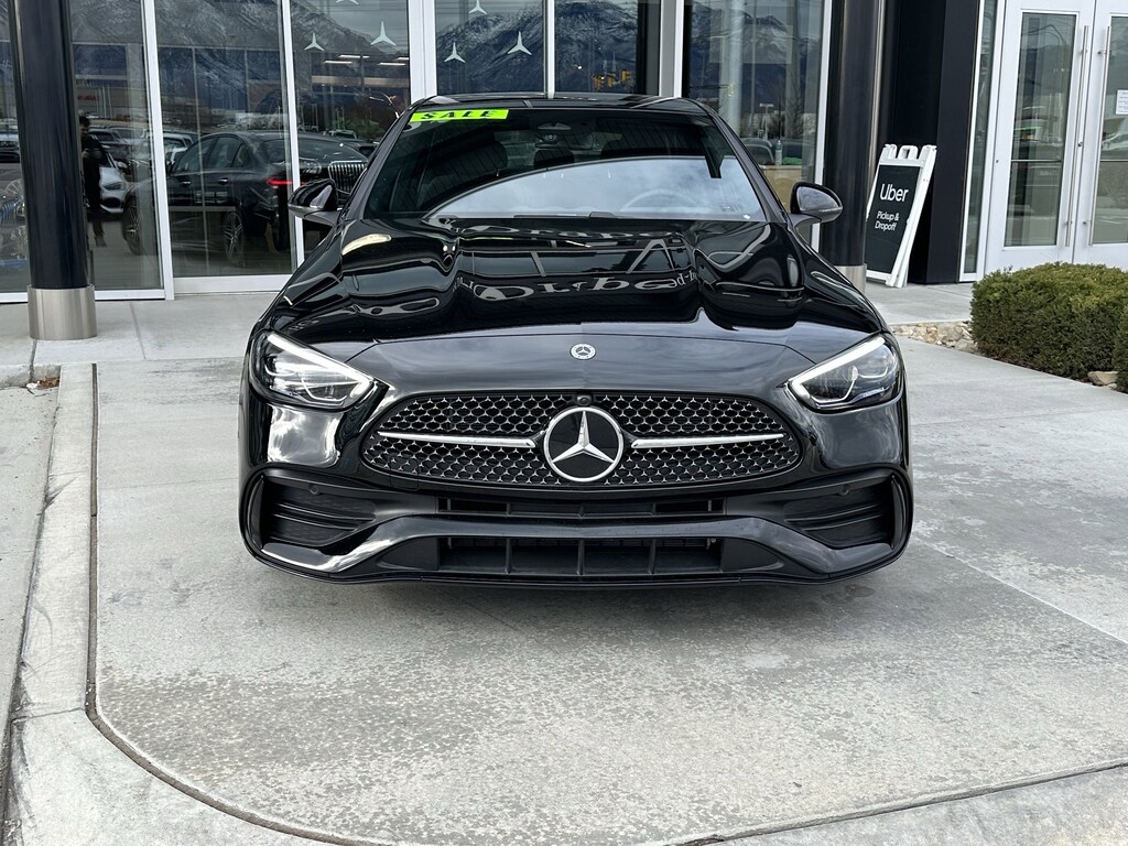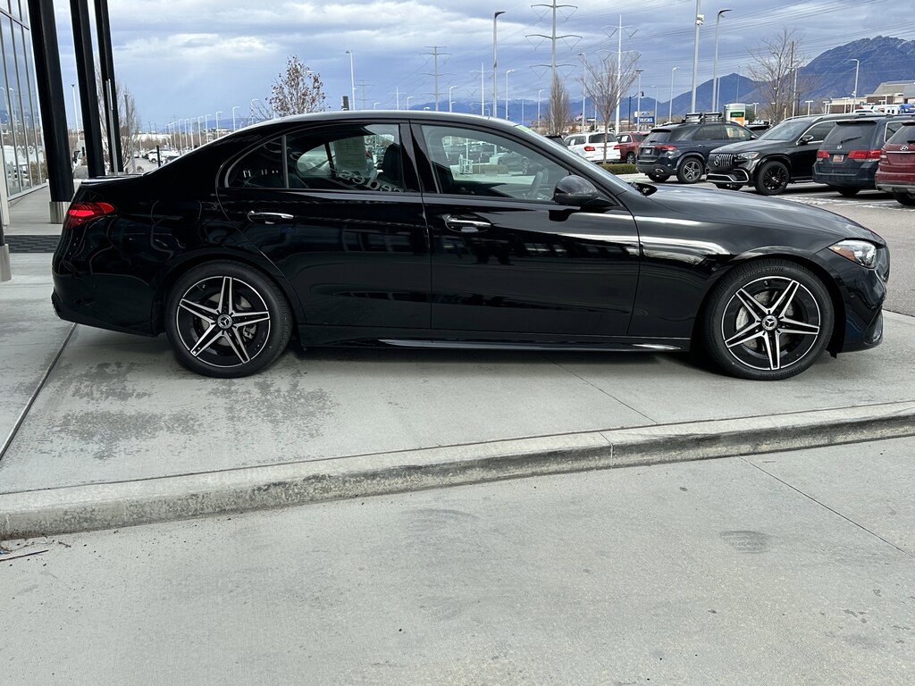 Mercedes-Benz of Draper proudly offers this 2025 Black Mercedes-Benz C 300 AWD . It is well equipped and includes these features and benefits: AMG® Line with Night Package (AMG® Body Styling, AMG® Line Exterior, MB-Tex Dashboard, Perforated Brake Discs, Sport Suspension with Sport Steering System, and Star Grille), Night Package, 4MATIC®, 11.9 Center Touchscreen Display, 18 5-Spoke Wheels, 4-Wheel Disc Brakes, 5 Speakers, ABS brakes, Air Conditioning, Alloy wheels, AM/FM radio: SiriusXM, AMG® Floor Mats, Anti-whiplash front head restraints, Apple CarPlay®/Android Auto®, Auto High-beam Headlights, Auto tilt-away steering wheel, Auto-dimming door mirrors, Auto-dimming Rear-View mirror, Automatic temperature control, Black Fabric Headliner, Brake assist, Brushed Aluminum Sport Pedals with Rubber Studs, Bumpers: body-color, Child-Seat-Sensing Airbag, Compass, Delay-off headlights, Driver door bin, Driver vanity mirror, Dual front impact airbags, Dual front side impact airbags, Electronic Stability Control, Emergency communication system: Mercedes-Benz Emergency Call Service, Exterior Parking Camera Rear, First Aid Kit, Flat-Bottom Steering Wheel, Four wheel independent suspension, Front anti-roll bar, Front Bucket Seats, Front Center Armrest, Front dual zone A/C, Front reading lights, Fully automatic headlights, Garage door transmitter: HomeLink, Genuine wood dashboard insert, Head restraints memory, Heated door mirrors, Heated front seats, Heated Steering Wheel, Illuminated entry, Knee airbag, Leather steering wheel, Low tire pressure warning, Lumbar Support, MB-Tex Upholstery, Memory seat, Metal Weave Center Console, Occupant sensing airbag, Outside temperature display, Overhead airbag, Overhead console, Panic alarm, Panorama Roof, Passenger door bin, Passenger vanity mirror, Power adjustable front head restraints, Power door mirrors, Power driver seat, Power Heated Front Seats with Memory, Power moonroof, Power passenger seat, Power steering, Power windows, Premium audio system: MBUX, Radio data system, Radio: FrontBass 5-Speaker Audio System, Rain sensing wipers, Rear anti-roll bar, Rear fog lights, Rear reading lights, Rear seat center armrest, Rear window defroster, Remote keyless entry, Security system, SiriusXM Satellite Radio, Speed control, Speed-sensing steering, Split folding rear seat, Steering wheel memory, Steering wheel mounted audio controls, Tachometer, Telescoping steering wheel, Tilt steering wheel, Traction control, Trip computer, Turn signal indicator mirrors, Variably intermittent wipers, Weather band radio, and Wheels: 18 AMG® 5-Spoke with Black Accents. Burmester is a registered trademark of Burmester Audiosysteme GmbH, Berlin, Germany. Bluetooth is a registered Mark of Bluetooth SIG, Inc.