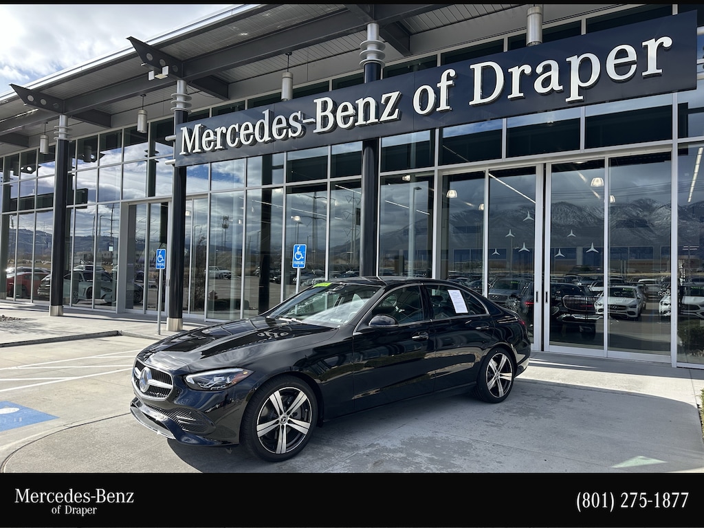 Mercedes-Benz of Draper proudly offers this 2025 Black Mercedes-Benz C 300 AWD . It is well equipped and includes these features and benefits: 4MATIC®, 11.9 Center Touchscreen Display, 18 5-Spoke Wheels, 4-Wheel Disc Brakes, 5 Speakers, ABS brakes, Air Conditioning, Alloy wheels, AM/FM radio: SiriusXM, Anti-whiplash front head restraints, Apple CarPlay®/Android Auto®, Auto High-beam Headlights, Auto tilt-away steering wheel, Auto-dimming door mirrors, Auto-dimming Rear-View mirror, Automatic temperature control, Black Fabric Headliner, Body Color Rear Spoiler, Brake assist, Bumpers: body-color, Child-Seat-Sensing Airbag, Compass, Delay-off headlights, Driver door bin, Driver vanity mirror, Dual front impact airbags, Dual front side impact airbags, Electronic Stability Control, Emergency communication system: Mercedes-Benz Emergency Call Service, Exterior Parking Camera Rear, First Aid Kit, Four wheel independent suspension, Front anti-roll bar, Front Bucket Seats, Front Center Armrest, Front dual zone A/C, Front reading lights, Fully automatic headlights, Garage door transmitter: HomeLink, Genuine wood dashboard insert, Head restraints memory, Heated door mirrors, Heated front seats, Illuminated entry, Knee airbag, Leather steering wheel, Low tire pressure warning, Lumbar Support, MB-Tex Upholstery, Memory seat, Occupant sensing airbag, Outside temperature display, Overhead airbag, Overhead console, Panic alarm, Passenger door bin, Passenger vanity mirror, Piano Black Lacquer Center Console, Power adjustable front head restraints, Power door mirrors, Power driver seat, Power Heated Front Seats with Memory, Power moonroof, Power passenger seat, Power steering, Power windows, Premium audio system: MBUX, Radio data system, Radio: FrontBass 5-Speaker Audio System, Rain sensing wipers, Rear anti-roll bar, Rear fog lights, Rear reading lights, Rear seat center armrest, Rear window defroster, Remote keyless entry, Security system, SiriusXM Satellite Radio, Speed control, Speed-sensing steering, Split folding rear seat, Steering wheel memory, Steering wheel mounted audio controls, Tachometer, Telescoping steering wheel, Tilt steering wheel, Traction control, Trip computer, Turn signal indicator mirrors, Variably intermittent wipers, Weather band radio, and Wheel Locking Bolts. Burmester is a registered trademark of Burmester Audiosysteme GmbH, Berlin, Germany. Bluetooth is a registered Mark of Bluetooth SIG, Inc.