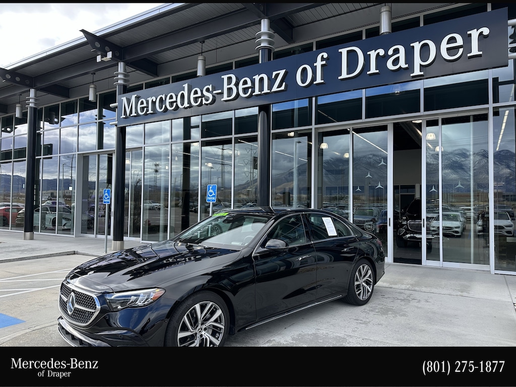 Mercedes-Benz of Draper proudly offers this 2025 Black Mercedes-Benz E 350 AWD . It is well equipped and includes these features and benefits: 2.0L I4 Turbocharged, 4MATIC®, 19 Multi-Spoke Light-Alloy Wheels, 4-Wheel Disc Brakes, 6 Speakers, ABS brakes, Air Conditioning, Alloy wheels, AM/FM radio: SiriusXM, Anti-whiplash front head restraints, Apple CarPlay®/Android Auto®, Auto High-beam Headlights, Auto tilt-away steering wheel, Auto-dimming door mirrors, Auto-dimming Rear-View mirror, Automatic temperature control, Brake assist, Bumpers: body-color, Center Console in Natural Grain Black Ash Wood, Delay-off headlights, Driver door bin, Driver vanity mirror, Dual front impact airbags, Dual front side impact airbags, Electronic Stability Control, Emergency communication system: eCall Emergency System, Exterior Parking Camera Rear, First Aid Kit, Four wheel independent suspension, Front anti-roll bar, Front Bucket Seats, Front Center Armrest w/Storage, Front dual zone A/C, Front reading lights, Fully automatic headlights, Garage door transmitter: HomeLink, Genuine wood dashboard insert, Head restraints memory, Heated door mirrors, Heated Front Bucket Seats, Heated front seats, Illuminated entry, Knee airbag, Leather steering wheel, Low tire pressure warning, MB-Tex Upholstery, Memory seat, Navigation system: MBUX, Occupant sensing airbag, Outside temperature display, Overhead airbag, Overhead console, Panic alarm, Passenger door bin, Passenger vanity mirror, Power adjustable front head restraints, Power adjustable rear head restraints, Power door mirrors, Power driver seat, Power moonroof, Power passenger seat, Power steering, Power windows, Premium audio system: MBUX, Radio data system, Radio: 3rd Generation MBUX Multimedia System with Navigation, Rain sensing wipers, Rear anti-roll bar, Rear fog lights, Rear reading lights, Rear seat center armrest, Rear window defroster, Remote keyless entry, Security system, Speed control, Speed-sensing steering, Split folding rear seat, Steering wheel memory, Steering wheel mounted audio controls, Tachometer, Telescoping steering wheel, Tilt steering wheel, Traction control, Trip computer, Turn signal indicator mirrors, Variably intermittent wipers, Weather band radio, and Wheel Locking Bolts. Burmester is a registered trademark of Burmester Audiosysteme GmbH, Berlin, Germany. Bluetooth is a registered Mark of Bluetooth SIG, Inc.