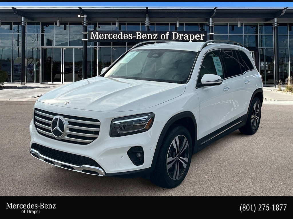 Mercedes-Benz of Draper proudly offers this 2025 White Mercedes-Benz GLB GLB 250 AWD . It is well equipped and includes these features and benefits: Winter Package (Heated Steering Wheel and Heated Windshield Washer Fluid), 4-Wheel Disc Brakes, 8 Speakers, ABS brakes, Air Conditioning, All-Weather Mats, Alloy wheels, AM/FM radio: SiriusXM, Apple CarPlay®/Android Auto®, Auto High-beam Headlights, Auto-dimming door mirrors, Automatic temperature control, Brake assist, Bumpers: body-color, Burmester® Surround Sound System. Burmester is a registered trademark of Burmester Audiosysteme GmbH, Berlin, Germany., Child-Seat-Sensing Airbag, Delay-off headlights, Driver door bin, Driver vanity mirror, Dual front impact airbags, Dual front side impact airbags, Electronic Stability Control, Emergency communication system: Mercedes-Benz Emergency Call Service, Exterior Parking Camera Rear, First Aid Kit, Four wheel independent suspension, Front anti-roll bar, Front Bucket Seats, Front Center Armrest, Front Comfort Seats, Front dual zone A/C, Front fog lights, Front reading lights, Fully automatic headlights, Garage door transmitter, Heated door mirrors, Heated front seats, Heated Seats, Illuminated entry, Knee airbag, LED Logo Projector, Low tire pressure warning, MB-Tex Upholstery, Memory seat, Music Streaming, Occupant sensing airbag, Outside temperature display, Overhead airbag, Overhead console, Panic alarm, Passenger door bin, Passenger vanity mirror, Power door mirrors, Power driver seat, Power Liftgate, Power passenger seat, Power steering, Power windows, Premium audio system: MBUX, Radio data system, Radio: Mercedes-Benz User Experience (MBUX), Rain sensing wipers, Rear anti-roll bar, Rear fog lights, Rear reading lights, Rear window defroster, Rear window wiper, Remote keyless entry, Security system, SiriusXM Satellite Radio, Speed control, Speed-sensing steering, Split folding rear seat, Spoiler, Steering wheel mounted audio controls, Tachometer, Telescoping steering wheel, Tilt steering wheel, Traction control, Trip computer, Turn signal indicator mirrors, Variably intermittent wipers, Wheel Locking Bolts, Wheels: 18 Twin 5-Spoke, and Wireless Charging. Burmester is a registered trademark of Burmester Audiosysteme GmbH, Berlin, Germany. Bluetooth is a registered Mark of Bluetooth SIG, Inc.