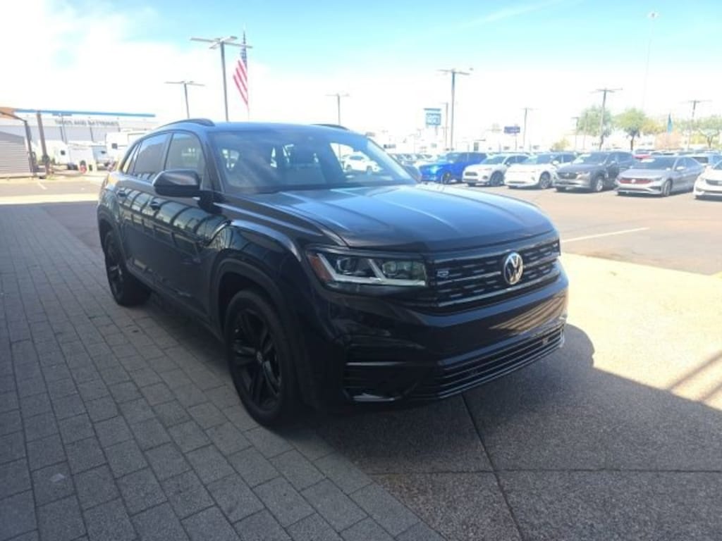 This 2023 Deep Black Volkswagen Atlas Cross Sport 3.6L V6 SEL R-Line AWD is well equipped and includes these features and benefits: 3.60 Axle Ratio, 4-Wheel Disc Brakes, 6 Speakers, ABS brakes, Air Conditioning, Alloy wheels, AM/FM radio: SiriusXM with 360L, Auto High-beam Headlights, Auto-dimming Rear-View mirror, Automatic temperature control, Brake assist, Bumpers: body-color, Carpeted Mats, Compass, Delay-off headlights, Driver door bin, Driver vanity mirror, Dual front impact airbags, Dual front side impact airbags, Electronic Stability Control, Emergency communication system: VW Car-Net Safe & Secure 5-year, Exterior Parking Camera Rear, Four wheel independent suspension, Front anti-roll bar, Front Bucket Seats, Front Center Armrest, Front dual zone A/C, Front fog lights, Front reading lights, Fully automatic headlights, Heated Comfort Front Bucket Seats, Heated door mirrors, Heated front seats, Heated steering wheel, Illuminated entry, Leather Shift Knob, Low tire pressure warning, Memory seat, Navigation System, Occupant sensing airbag, Outside temperature display, Overhead airbag, Overhead console, Panic alarm, Passenger door bin, Passenger vanity mirror, Perforated V-Tex Leatherette Seating Surfaces, Power door mirrors, Power driver seat, Power Liftgate, Power moonroof: Panoramic, Power passenger seat, Power steering, Power windows, Radio data system, Radio: MIB3 Discover Media w/8 Touchscreen Navigation, Rain sensing wipers, Rear anti-roll bar, Rear reading lights, Rear seat center armrest, Rear window defroster, Rear window wiper, Remote keyless entry, Security system, Speed control, Speed-sensing steering, Split folding rear seat, Spoiler, Sport steering wheel, Standard Suspension, Steering wheel mounted audio controls, Tachometer, Telescoping steering wheel, Tilt steering wheel, Traction control, Trip computer, Turn signal indicator mirrors, Variably intermittent wipers, and Wheels: 20 x 8J 5-Spoke Black Painted Alloy. 3.60 Axle Ratio, 4-Wheel Disc Brakes, 6 Speakers, ABS brakes, Air Conditioning, Alloy wheels, AM/FM radio: SiriusXM with 360L, Auto High-beam Headlights, Auto-dimming Rear-View mirror, Automatic temperature control, Brake assist, Bumpers: body-color, Carpeted Mats, Compass, Delay-off headlights, Driver door bin, Driver vanity mirror, Dual front impact airbags, Dual front side impact airbags, Electronic Stability Control, Emergency communication system: VW Car-Net Safe & Secure 5-year, Exterior Parking Camera Rear, Four wheel independent suspension, Front anti-roll bar, Front Bucket Seats, Front Center Armrest, Front dual zone A/C, Front fog lights, Front reading lights, Fully automatic headlights, Heated Comfort Front Bucket Seats, Heated door mirrors, Heated front seats, Heated steering wheel, Illuminated entry, Leather Shift Knob, Low tire pressure warning, Memory seat, Navigation System, Occupant sensing airbag, Outside temperature display, Overhead airbag, Overhead console, Panic alarm, Passenger door bin, Passenger vanity mirror, Perforated V-Tex Leatherette Seating Surfaces, Power door mirrors, Power driver seat, Power Liftgate, Power moonroof: Panoramic, Power passenger seat, Power steering, Power windows, Radio data system, Radio: MIB3 Discover Media w/8 Touchscreen Navigation, Rain sensing wipers, Rear anti-roll bar, Rear reading lights, Rear seat center armrest, Rear window defroster, Rear window wiper, Remote keyless entry, Security system, Speed control, Speed-sensing steering, Split folding rear seat, Spoiler, Sport steering wheel, Standard Suspension, Steering wheel mounted audio controls, Tachometer, Telescoping steering wheel, Tilt steering wheel, Traction control, Trip computer, Turn signal indicator mirrors, Variably intermittent wipers, Wheels: 20 x 8J 5-Spoke Black Painted Alloy.